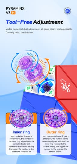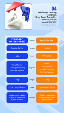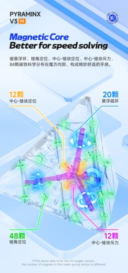 Expected delivery Fri Apr 24 2026Designed for speed and control, the DaYan Pyraminx V3 MagLev UV is a smooth, quick-turning pyraminx. Its 10-magnet ball core improves stability and makes every rotation smooth and accurate. The UV-coated finish offers a gripping, glossy surface that resists wear, while the MagLev technology lowers friction for faster, quieter movement. For those seeking optimal performance with little preparation, this puzzle is perfect right out of the box.