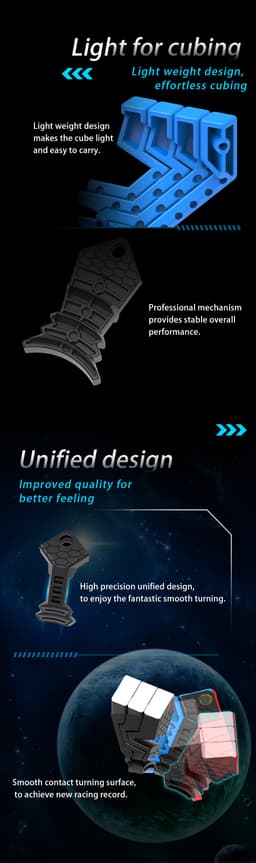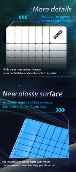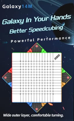 The Galaxy 14x14 has a streamlined design that reduces bulk without sacrificing performance, and it is surprisingly light and small for its size. It is perfect for collectors and professional huge cube solvers because of its superb corner cutting and low lockups.