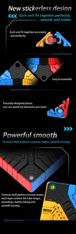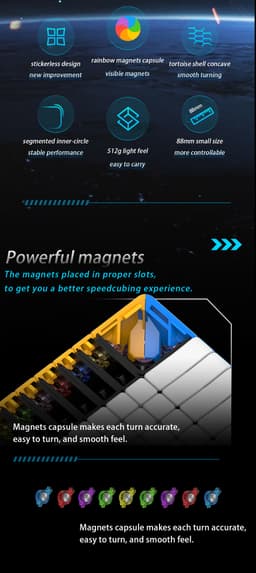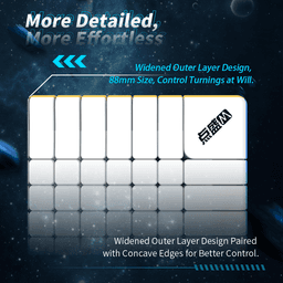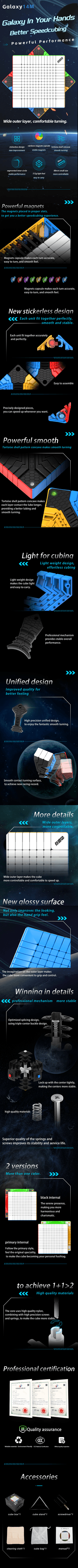 The Galaxy 14x14 has a streamlined design that reduces bulk without sacrificing performance, and it is surprisingly light and small for its size. It is perfect for collectors and professional huge cube solvers because of its superb corner cutting and low lockups.