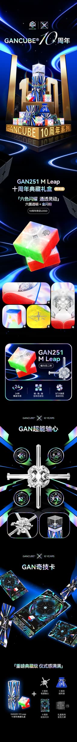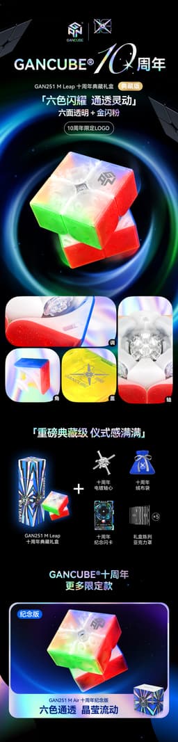 Expected delivery Wed May 06 2026With a superior fusion of design and functionality, the GAN 251M Leap 2x2 UV 10th Anniversary (Transparent) commemorates ten years of GAN's innovation. This cube's translucent, multicolored shell and glossy UV-coated finish combine eye-catching appearance with a feel that is sturdy, smooth, and incredibly controlled. For cubers looking for the highest degree of precision, the GAN 251M Leap is ideal since it is constructed with sophisticated magnet placement for enhanced stability and smooth turning. This unique version, which comes in a striking 10th Anniversary holographic box, is a colorful and valuable addition to any cuber's collection.