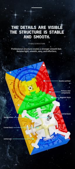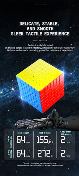 The MoSheng 7x7, which weighs 155.2 grams and has a small 64mm side length, is designed with a sophisticated 2mm plastic thickness that strikes the ideal balance between performance and longevity. The cube has a smooth tactile feel that seasoned cubers will love, as well as striking, colorful stickerless shades for the best color identification during quick solutions.